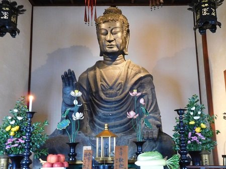 飛鳥寺本堂。境内にはベンチもあり、休憩やバス待ちに便利です。