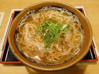 油かすを上置きにしたかけそば。本来はうどん台。油かすとは牛の腸を脂でカリカリになるまで揚げたもの。(かすそば 伊丹 月山そば本店)